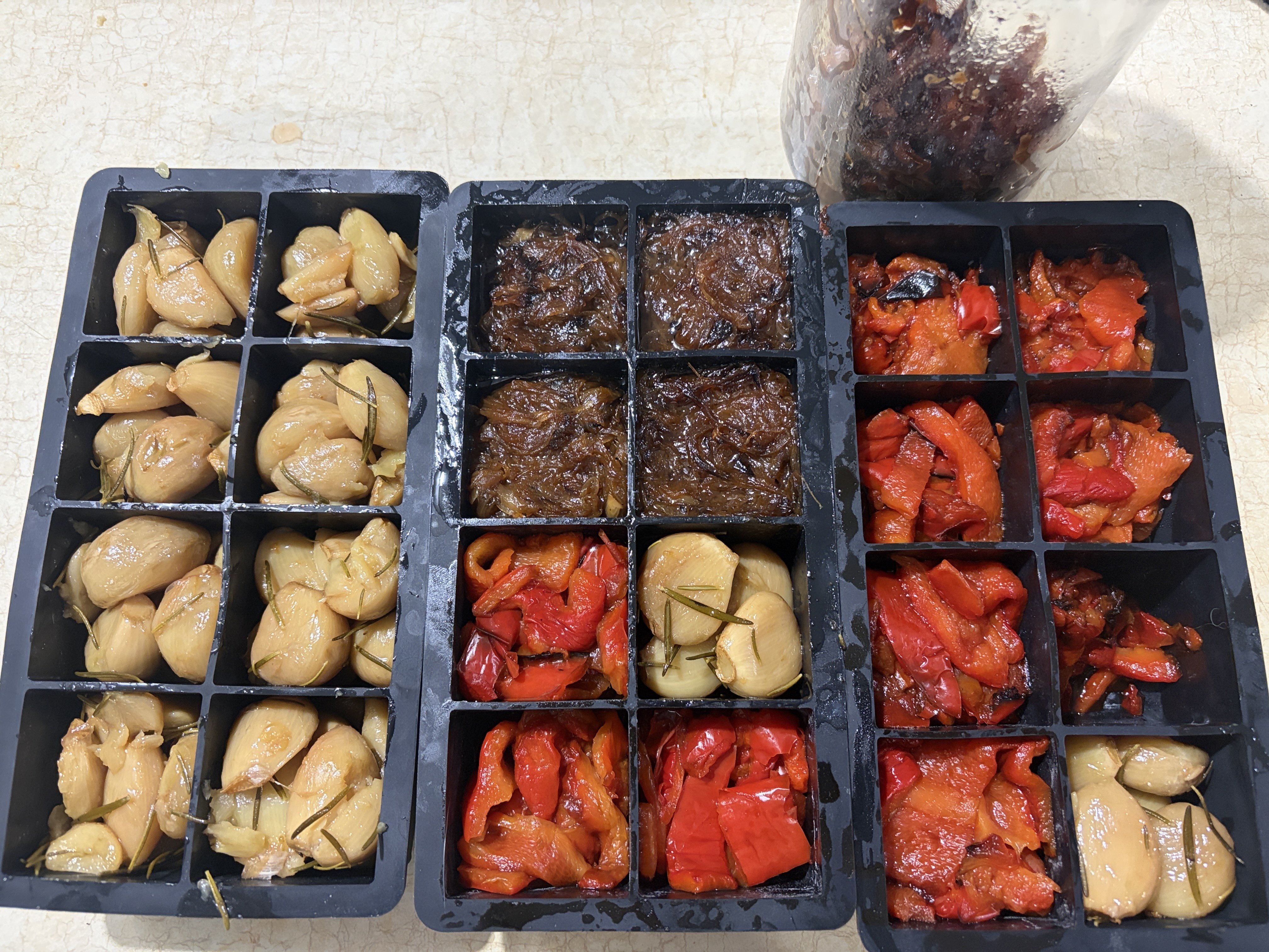 According to google, because I don't have a pressure canner, using the big jars is dumb because things like roasted red peppers will only last for a few weeks in the fridge, so it'd be smarter to freeze smaller portions and take them out one at a time instead of thawing a whole jar of something and having most of it not get used. That's kind of lame, but alas. At least I have those ice cube trays that make the really big cubes. I think this is the plan: