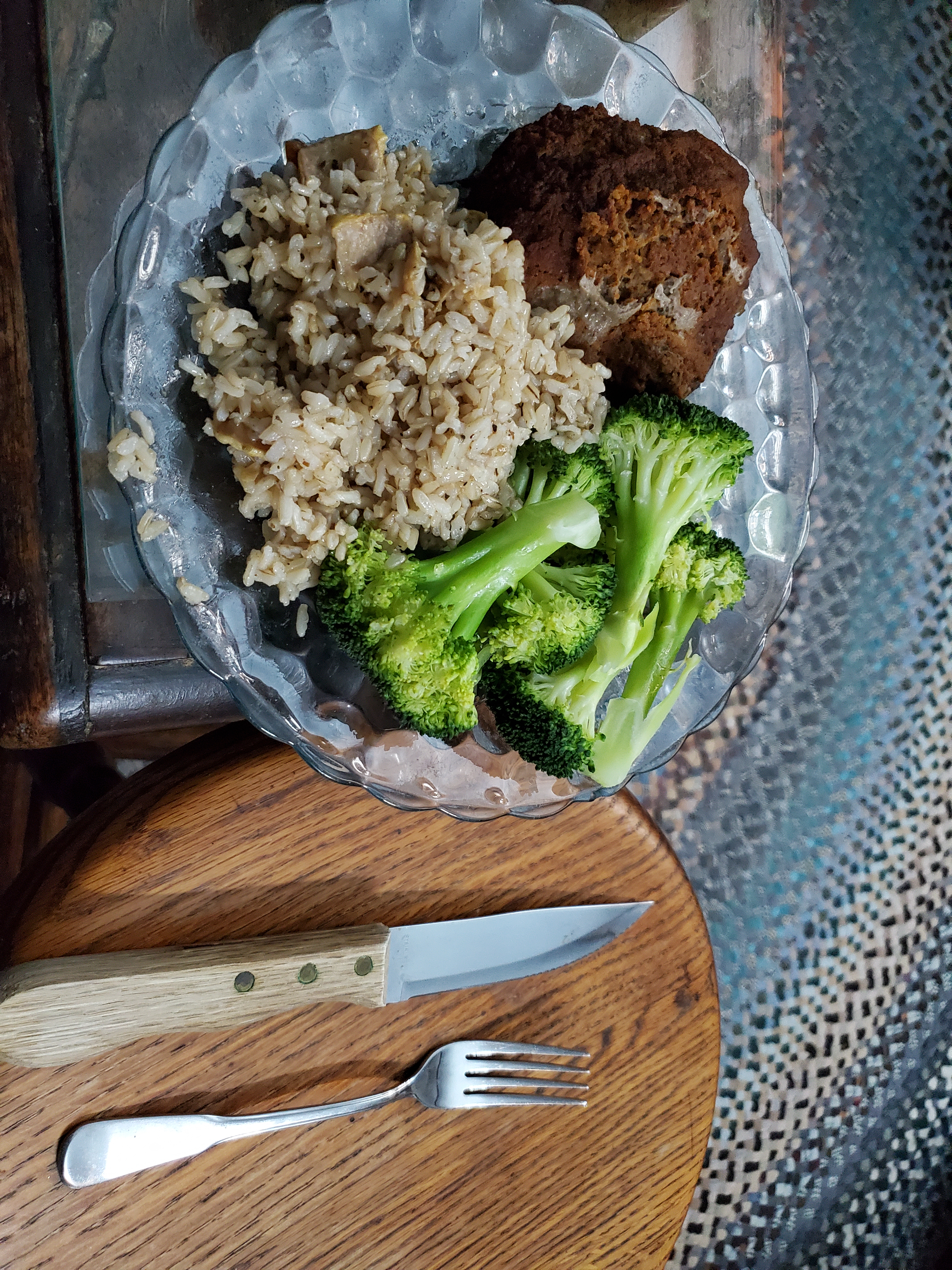 Portobello caps with meatloaf topping, broccoli, and rice with dried summer squash.