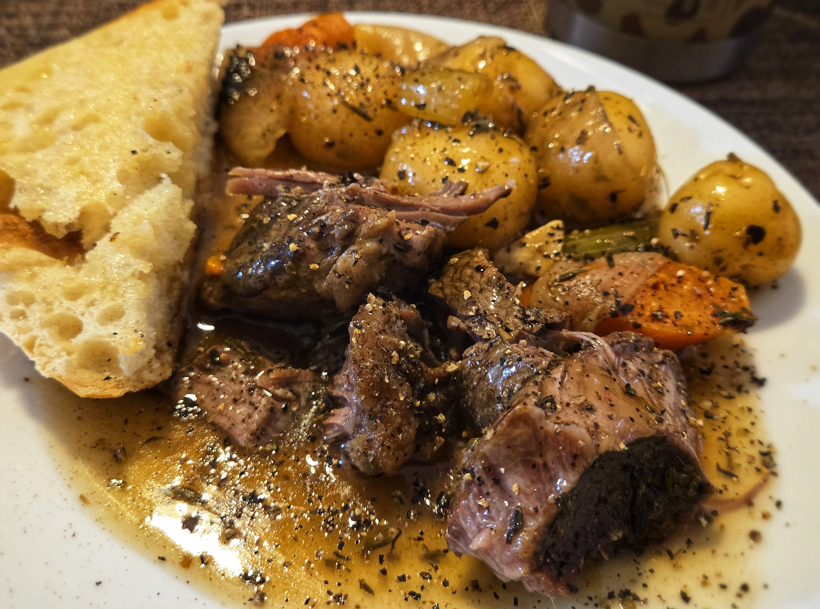 Small sirloin roast with taters, carrots, celery, and garlic.