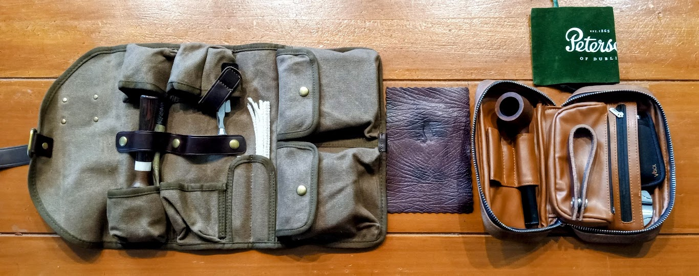 I'm curious how you carry your pipes with you on trips? I have two main pipe bags, a MrPyer 4 pipe canvas bag (https://a.co/d/883ZSp8) that has pouches for two tins or pocket jars, a couple of compartments for pipe cleaners and accessories, and a leather strap that doubles as a pipe rest for longer trips and a Scotte pleather pipe bag (https://a.co/d/4PKfkqb) with a pleather tobacco pouch and some pockets for pipe cleaners and accessories for day trips. They both work well, I think I like the MrPyer better, the leather tobacco prep pad and the Peterson pipe bag was not included.