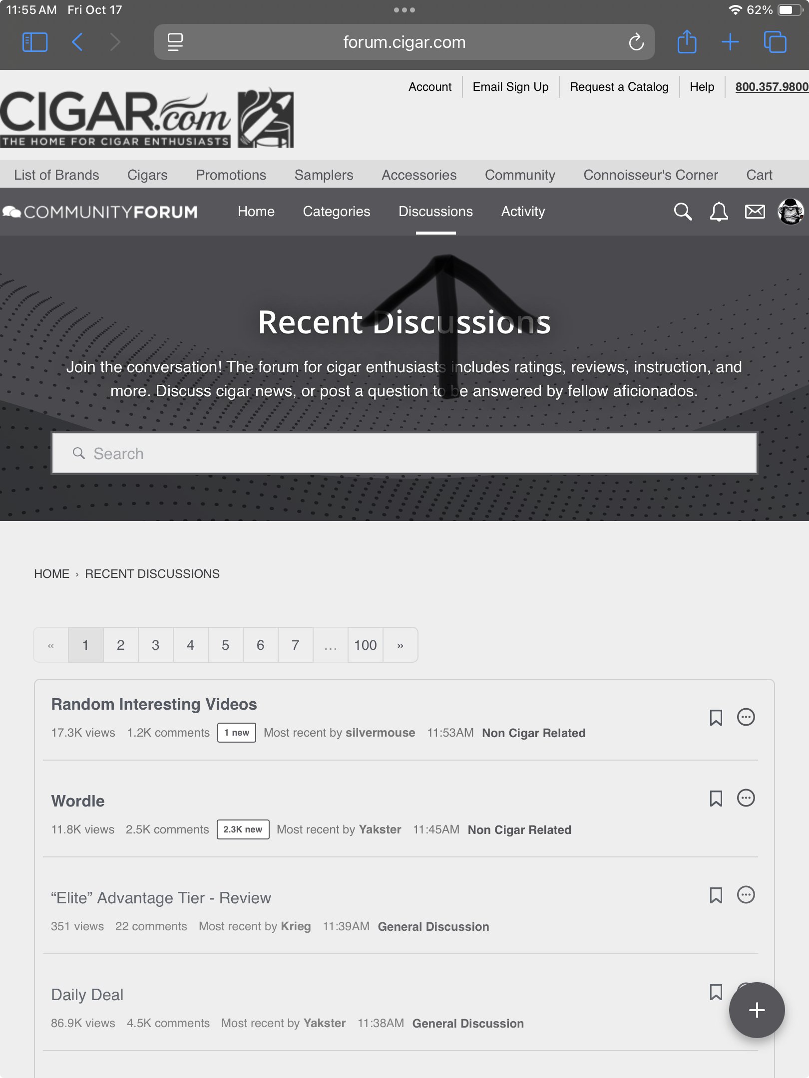 @OutdoorsSmoke_21191: If you click the second hamburger menu at the top of the screen, the one for the forum instead of the one for the main cigar.com site, you can then select Discussions which will take you right to recent discussions. See below.