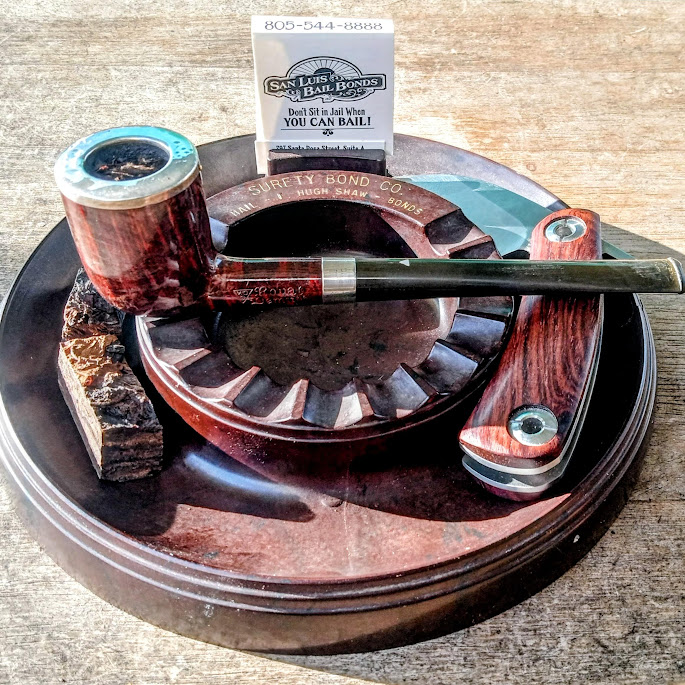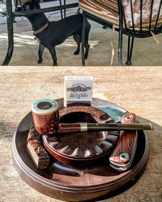 Smoking some Revor Plug in my circa 1934 WDC (William Demuth Company) Royal Demuth Bing Billiard. The silver was looking a bit tarnished so I polished it up a bit first with cigar ash. The HellMutt in the background tracking a squirrel on the fence.